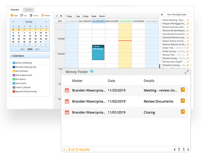 - Billing for Tasks & Meetings: Our Money Finder feature catches any billable events and tasks where time has yet to be tracked so you can review it as a possible billable item. Enter timecards and attach them to a task or event to mitigate potential client disputes.